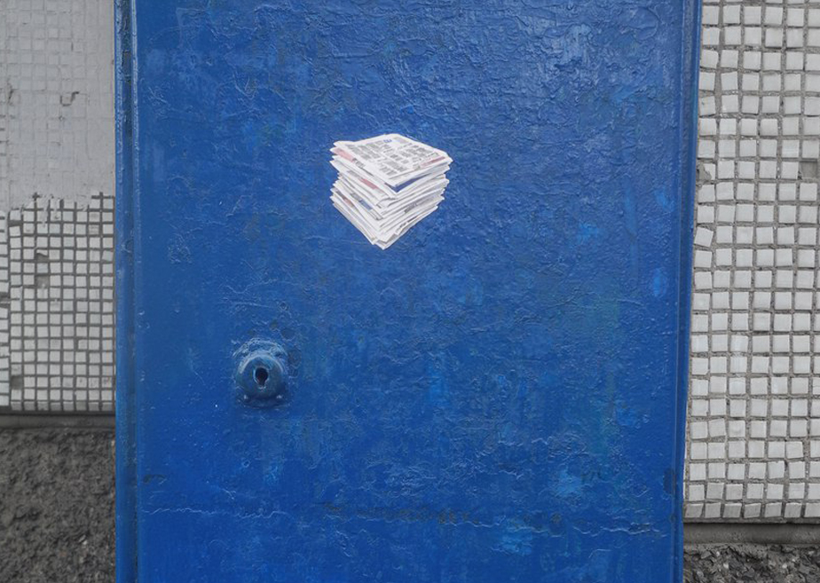 На Ады Лебедевой, 31 сразу три небольших объекта: очень маленькие газеты, щит-дублер и секретная дверь, как в «Алисе» Кэролла.