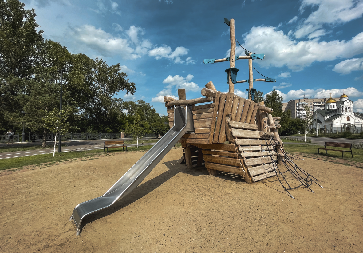 Благоустройство правобережной набережной началось в 2019 году. Там появились зоны для спорта, беговые и велосипедные дорожки, новая уличная мебель и детские площадки. На верхнем ярусе городок небольшой — для малышей кораблик с горкой, качели и полоса препятствий. А вот на нижнем площадка оформлена в морском стиле, что смотрится очень гармонично на берегу Енисея. Там есть корабль, скалодром, лазилки, качели, гамак, небольшой веревочный городок — он внешне отличается от тех, что привыкли видеть на детских площадках. Именно у него детей постарше особенно много. Родители следят, чтобы дети подождали немного, а не карабкались толпой. Покрытие резиновое. Также есть необычная конструкция — ковш. Можно представить, что ты экскаваторщик и немного поработать — черпать ковшом песок. Во всех зонах игровой площадки есть лавочки, родители могут спокойно сидеть и наблюдать за детьми.