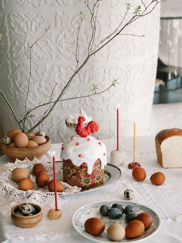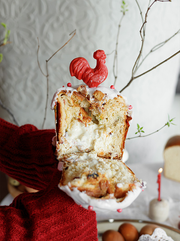 Кулич в русском стиле с цукатами — 1390 рублей. Всё тот же авторский рецепт дрожжевого теста от кондитеров LaFamille Group с вяленой клюквой, цукатами, изюмом и цедрой лимона. В середине — сливочно-заварной крем «Пломбир». Украшен кулич сахарной помадкой, съедобными бусинами и шоколадным петушком.