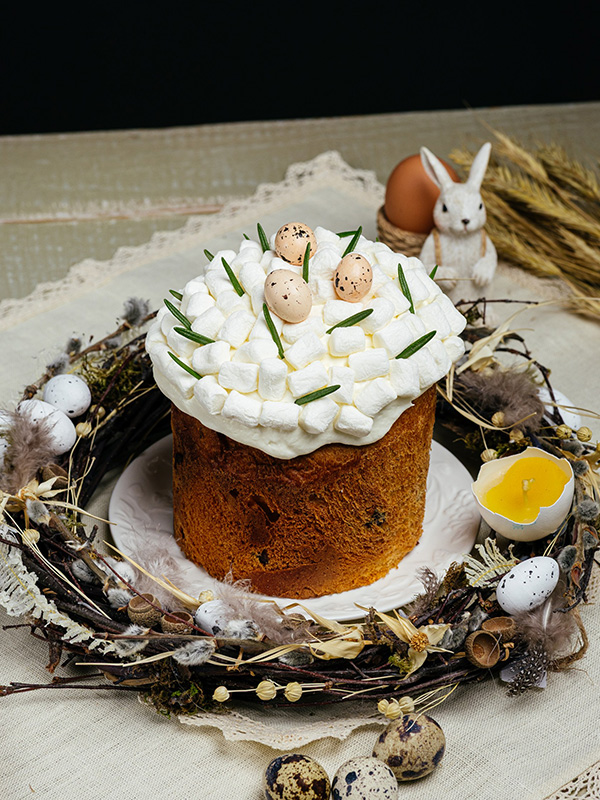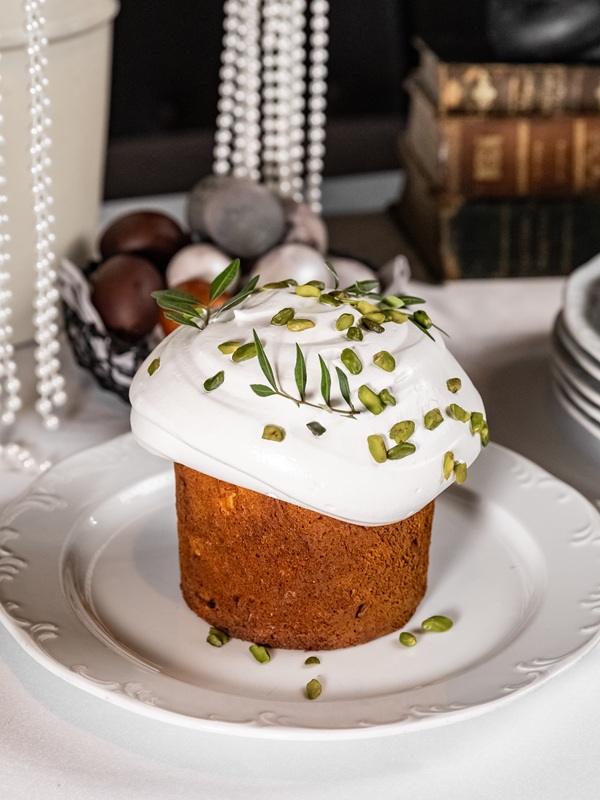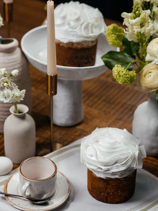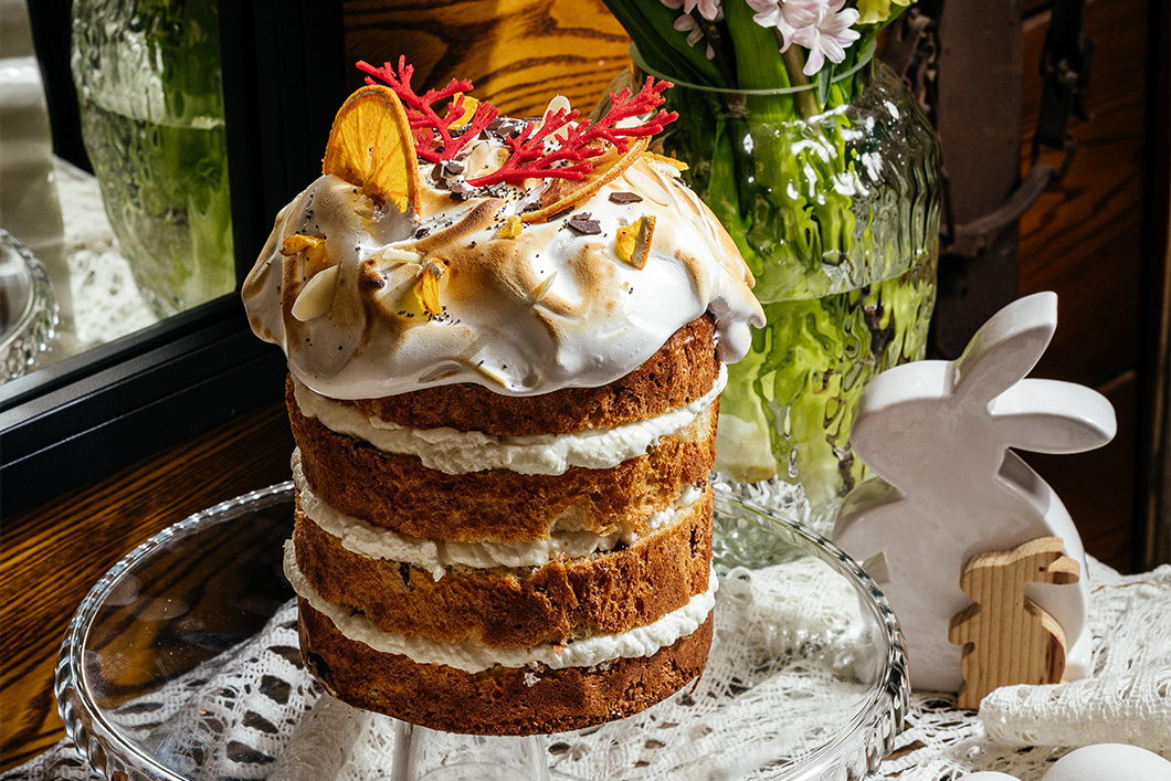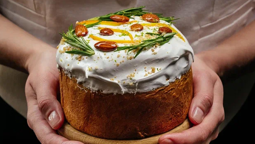 Кулич — 850 рублей. Сочные цукаты, воздушный лимонный курд с лёгкой кислинкой, нежная меренга, хрустящий миндаль в карамели и пряный розмарин. Сдоба идеальна для тех, кто ценит классический вкус с яркими нотками.