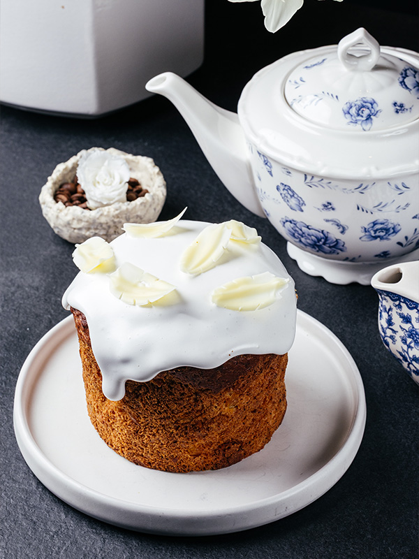 Творожный кулич — 1390 рублей — с апельсиновыми цукатами собственного приготовления и кусочками белого шоколада, наполненный воздушным ванильным кремом.