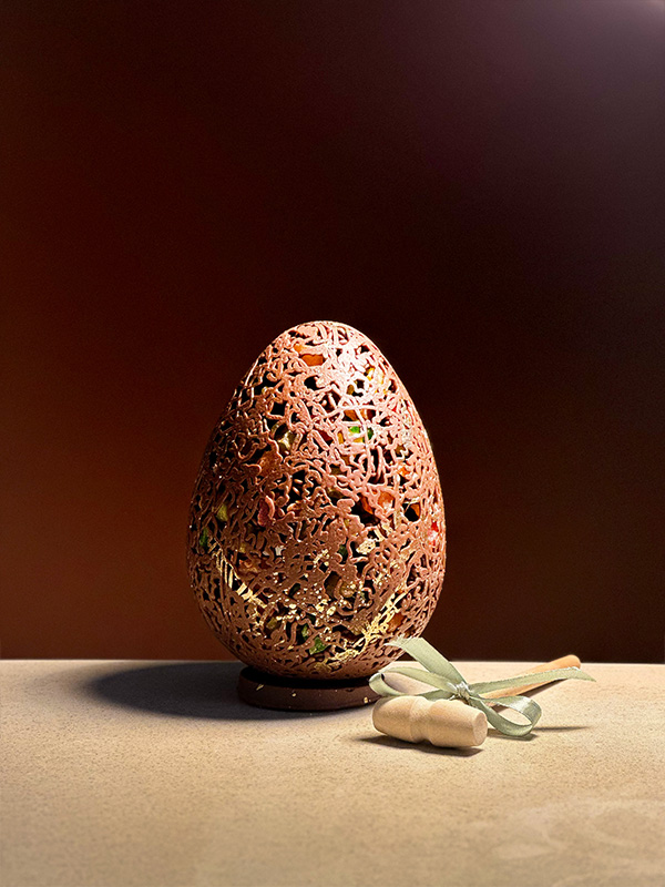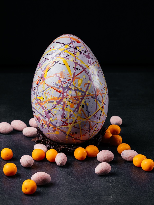 Шоколадное яйцо с драже — 1590 рублей — корпус из тёмного шоколада, внутри нежный апельсиновый мармелад с кусочками ароматных цукатов и хрустящий карамелизированный миндаль в белом шоколаде с добавлением сублимированной клубники.