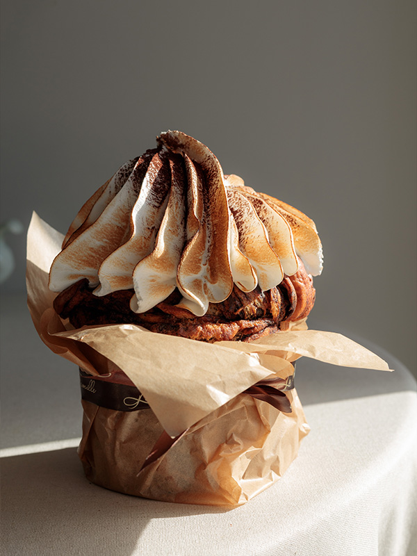 Шоколадный панеттоне — 1290 рублей — с изюмом, пропитанным сиропом амаретто, и шоколадно-кофейным кремом