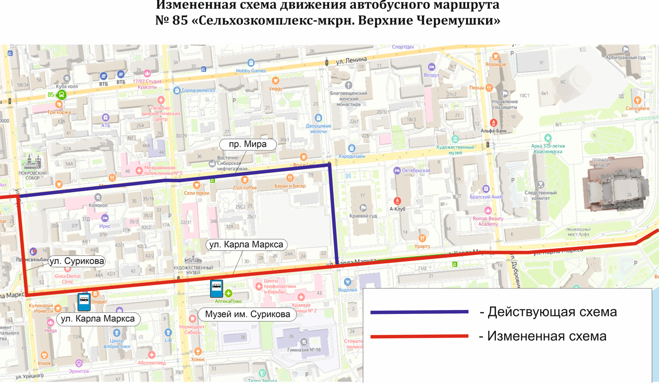 С 24 апреля автобусы маршрута №85 в историческом центре будут сворачивать с проспекта Мира на Карла Маркса через улицу Сурикова.