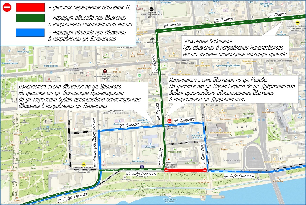 На участке от Диктатуры Пролетариата до дома № 100 по Дубровинского движение запретят. На участке от дома № 106 до дома № 100, а также в районе ул. Перенсона, 2 на участке длиной не более 40 м, будет сужена проезжая часть.