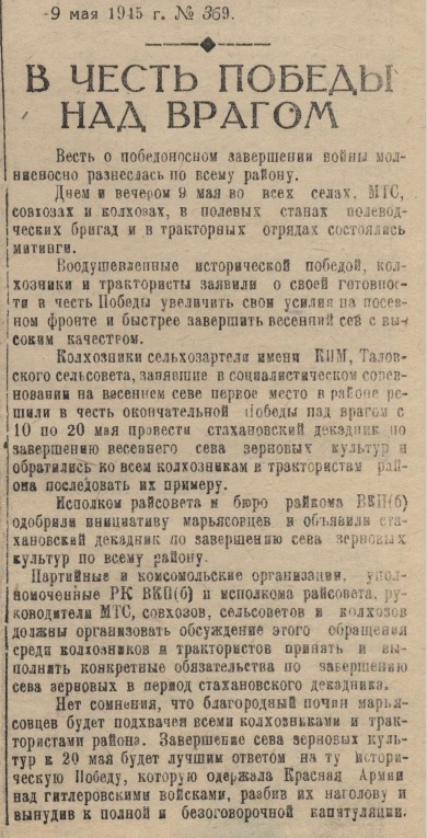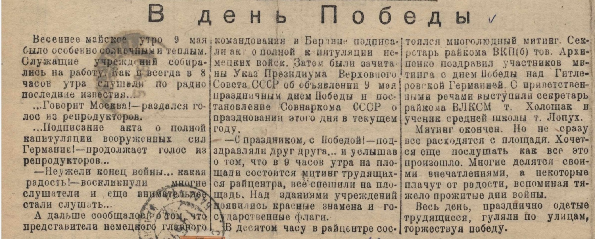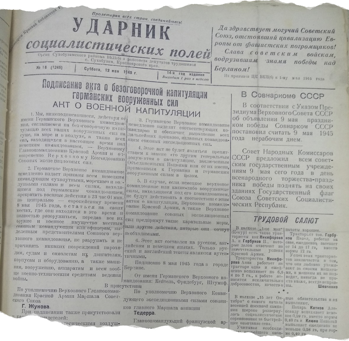 Кровопролитная война, которая продолжалась более четырёх лет и унесла жизни миллионов советских граждан, завершилась 8 мая подписанием акта о безоговорочной капитуляции германских вооружённых сил. Его копию тиражировали и районные газеты.