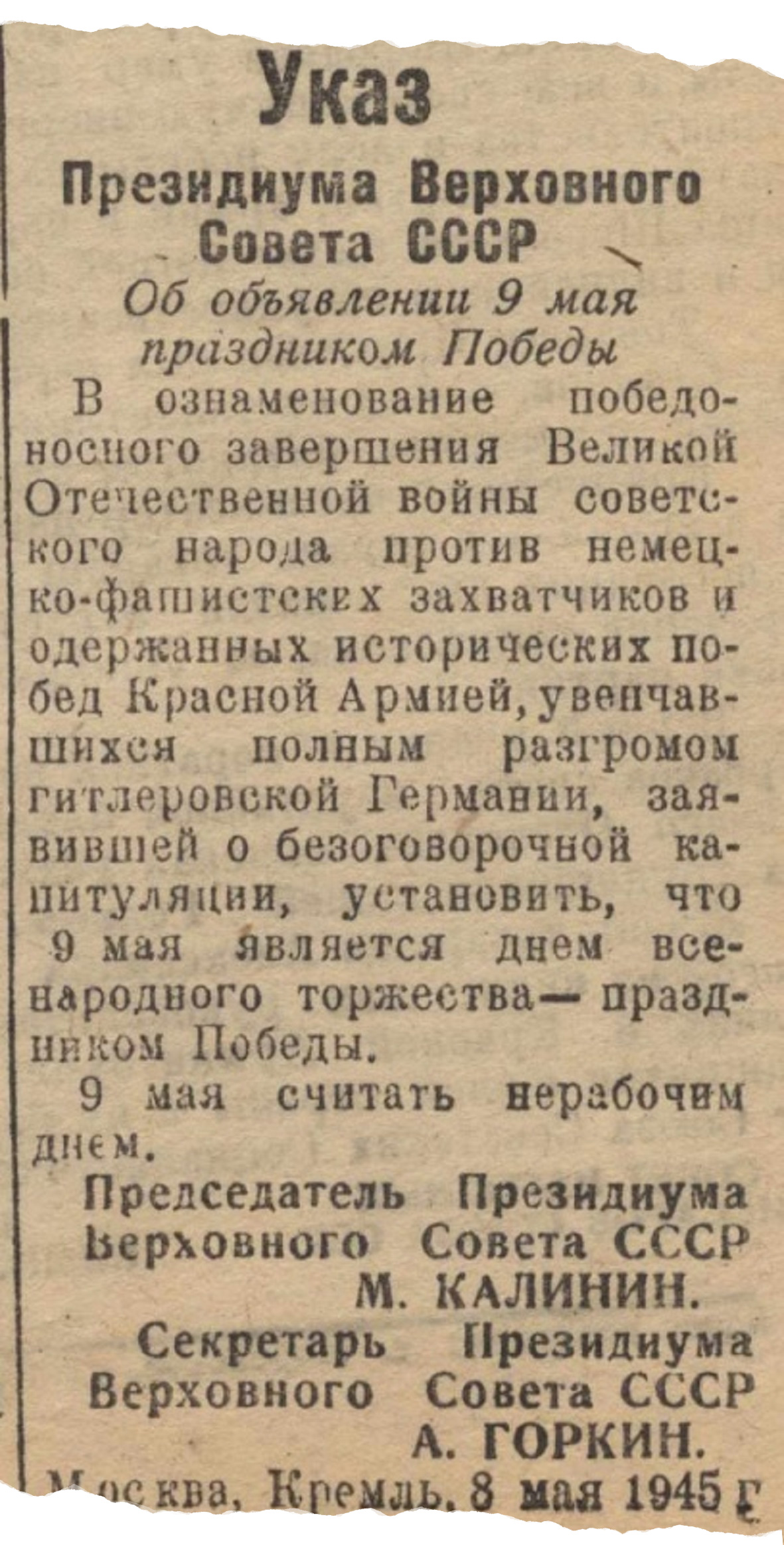 Многие издания также публиковали указ Президиума Верховного Совета СССР «Об объявлении 9 мая Праздником Победы», подписанный председателем Михаилом Калининым и секретарем Александром Горкиным.