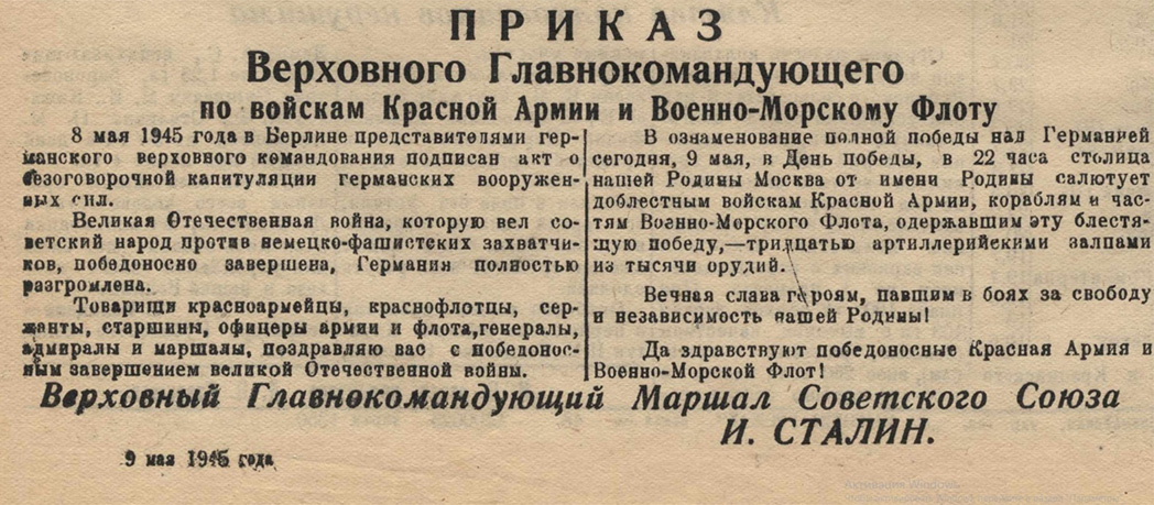 Товарищи! Великая Отечественная война завершилась нашей полной победой— период войны в Европе кончился. Начался период мирного развития. С победой вас, мои дорогие соотечественники и соотечественницы!
