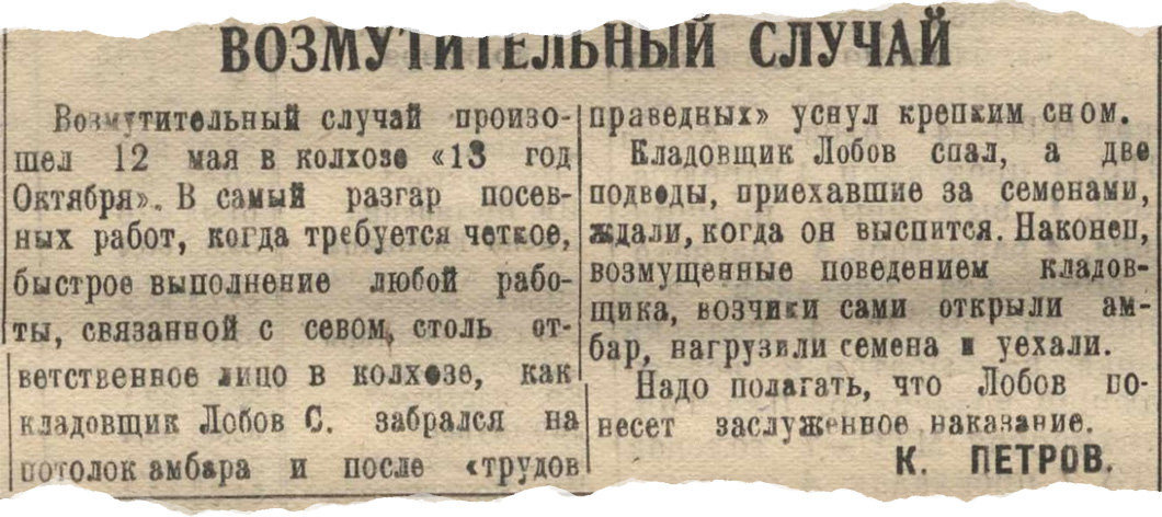Пока ударники в очередной раз перевыполняли нормы, некоторые люди своими обязанностями пренебрегали. Вот заметка «Возмутительный случай» из газеты «За ударные темпы».