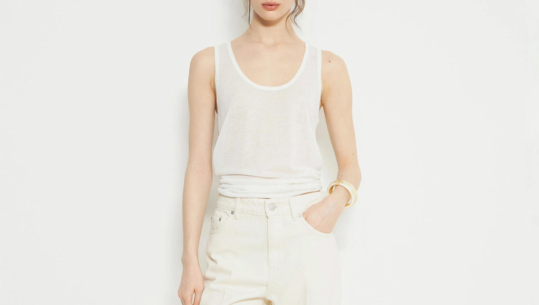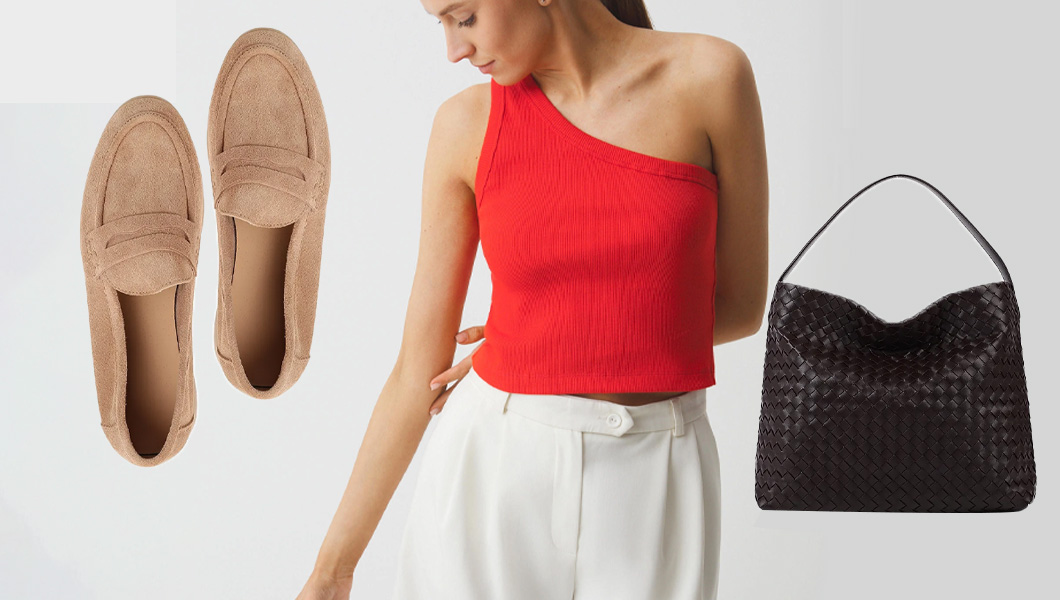 - Льняные широкие брюки + топ на одно плечо + замшевые лоферы + сумка из плетёной кожи.