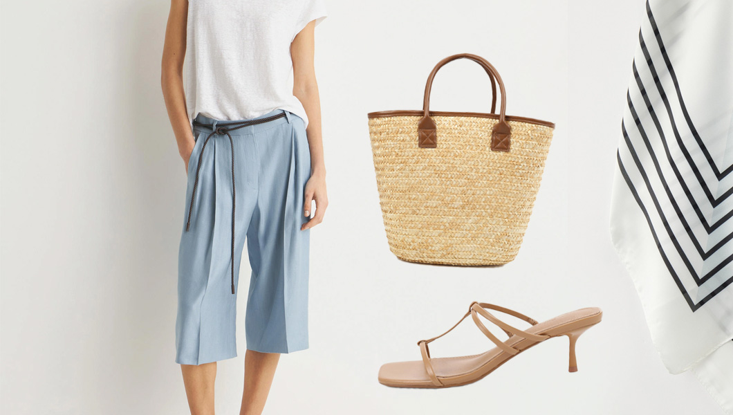- Шорты-бермуды + майка + вьетнамки на каблуке + соломенная сумка + платок на голову