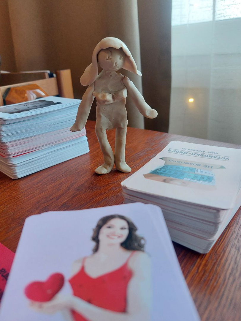 Тут работа с метафорическими картами-картинками. Игрок выбирает карту, которая триггерит. Выявляем скрытые точки стресса, даже те, в которых себе не признавались — с картинками легче открыться.