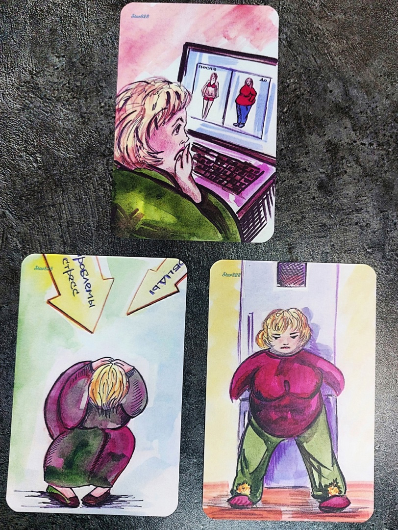 Мы работаем с семейными традициями из детства, семьи, социальными ярлыками, личными установками, эмоциональным фоном. Самое страшное, когда люди, не понимая сути, начинают считать себя безвольными, и чувство нелюбви к телу перерастает в нелюбовь к личности. Это стресс, его заедают, и получается замкнутый круг, который мы разрываем в игре, меняя пищевое поведение.