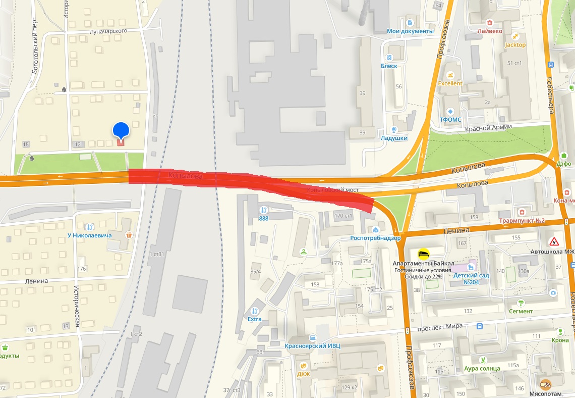 С 08:00 10 июня дорога от Копылова, 4 до съезда на улице Профсоюзов будет сужена. Участок планируют ремонтировать над железнодорожными путями, поэтому ограничения будут действовать в обе стороны.