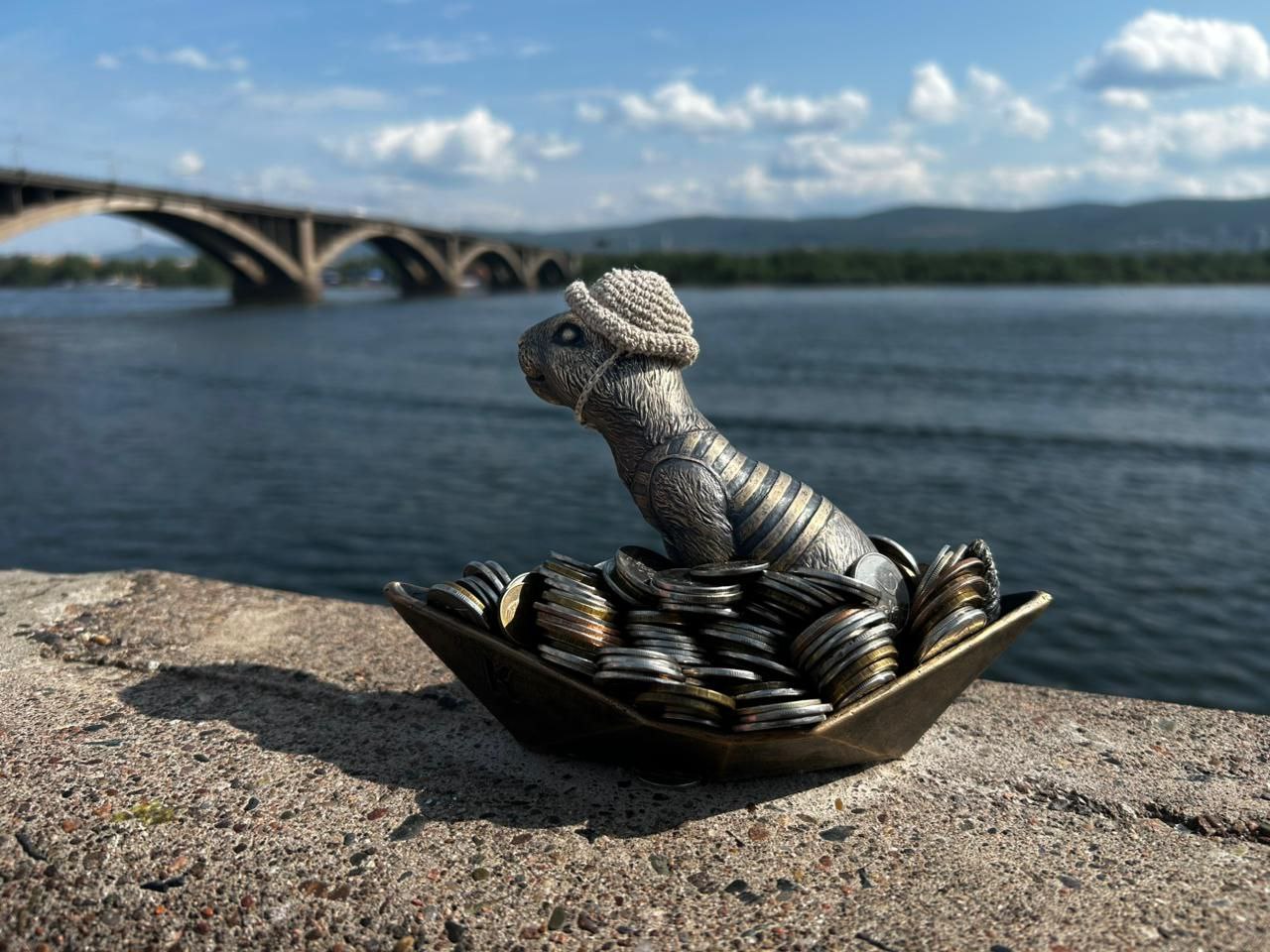 Суслик-речник появился на Коммунальном мосту 1 июня. Он сразу же полюбился красноярцам. Горожане выстраиваются в очередь, чтобы сфотографировать с бронзовыми зверьком, и оставляют монетки около фигурки.