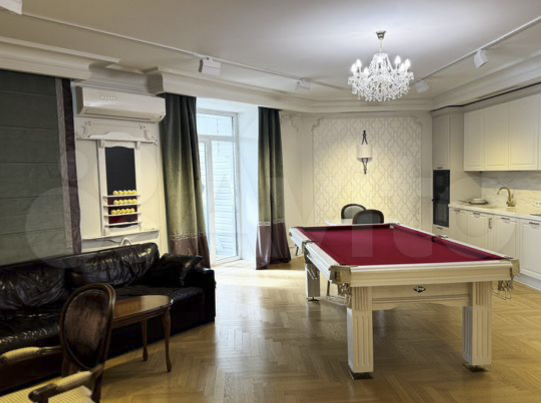 Что касается окружения, тут всё так же, как и в предыдущем варианте, а вот «начинка» отличается. У этой квартиры помимо дизайнерского ремонта, тёплого пола и полного набора мебели и техники две фишки. Это сауна и бильярдный стол, который выпрыгивает буквально с каждой фотографии.