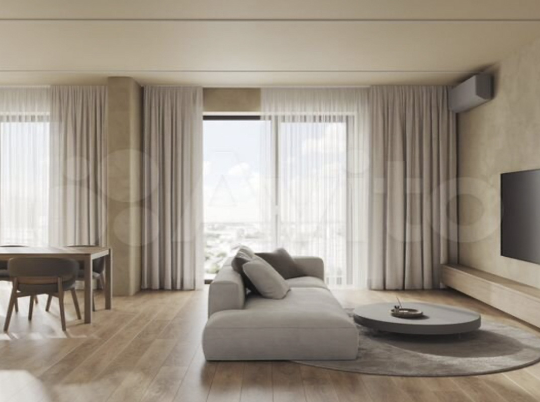 Готова сейчас только отделка, техника закуплена, а мебель находится в производстве. В гостиной будет широкий светлый диван и круглый журнальный столик, на кухне — гарнитур и обеденная группа, в спальне — большая кровать и тумбочки. Всё в одной цветовой гамме: от молочного до кофе с молоком. Везде зеркала и телевизоры.