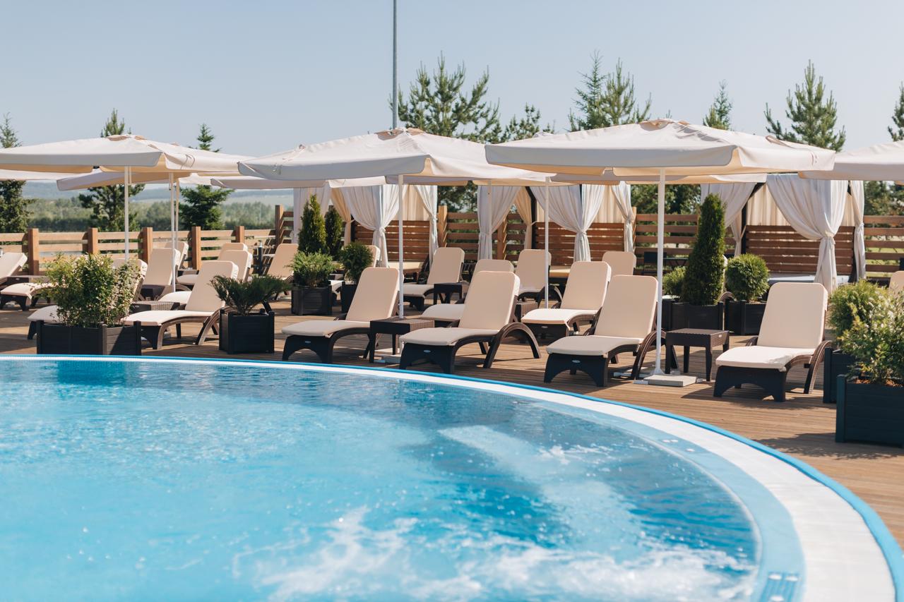 Здесь два бассейна под открытым небом и зона с лежаками. Они расположены в центре экопарка, откуда открывается вид на море и горы. Температура воды около +27 градусов.