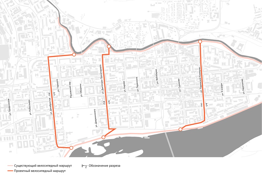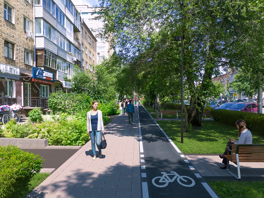 При этом на трёх улицах — Декабристов, Диктатуры Пролетариата и Парижской коммуны — появятся велодорожки. Таким образом хотят связать велосипедные маршруты, которые проходят по набережным Енисея и Качи. Архитекторы уточняют, что это обеспечит удобное перемещение между общественными пространствами.