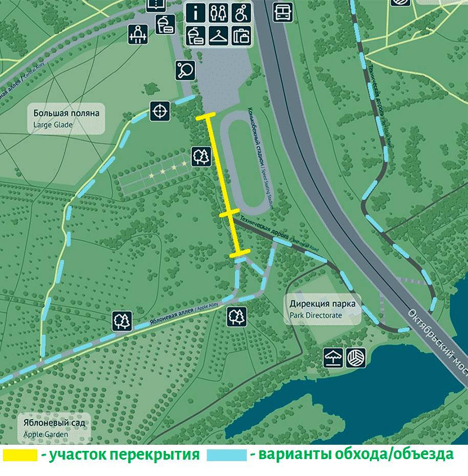 — Участок вело-пешеходной дорожки у конькобежного стадиона будет перекрыт с 15 июля по 25 июля. Здесь будут проводить работы по замене асфальто-бетонного покрытия. Для вашего удобства обозначили на карте участок перекрытия и пути обхода/объезда. Её можно найти в соцсетях. Просим отнестись с пониманием к временным неудобствам, постараемся закончить как можно скорее.​