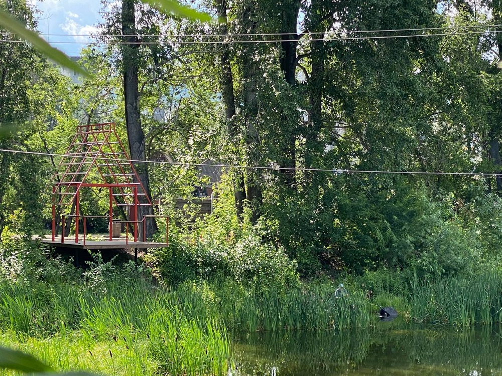 На берегу второго озера, со стороны жилой застройки, появилось что-то вроде смотровой площадки. Это красная металлическая конструкция в форме домика с деревянным настилом и почему-то совсем без ограждений. Вероятно, они в перспективе.