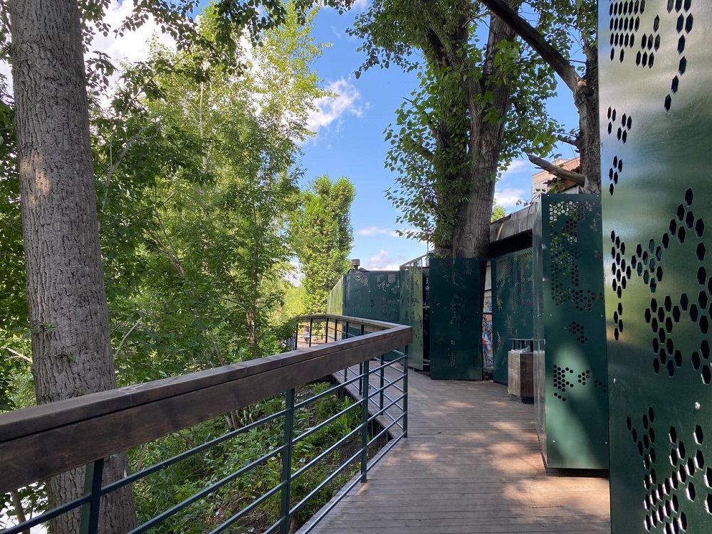 И ещё, к сожалению, оправдались наши предположения по поводу металлического мостика у первого озера. Настил напоминает пружинящий матрас для кровати, только отверстия здесь больше. Коляски, велосипеды и самокаты на ребристой поверхности потряхивает. А на шпильках тут и шагу не сделать — каблуки проваливаются.