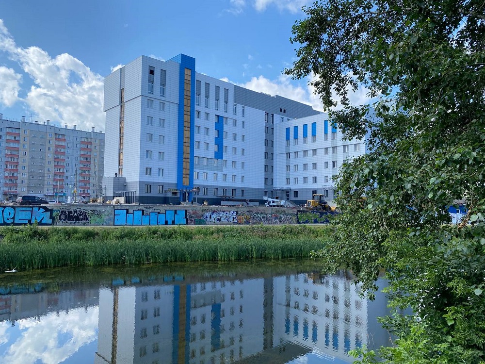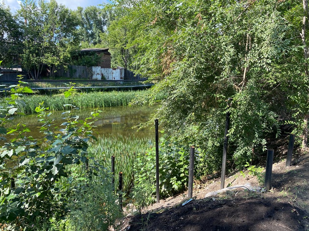Раньше третья запруда на Судостроительной была обрамлена гаражами с одной стороны, и жилой застройкой — с другой. Деревянные домишки вдоль проезжей части давно ликвидировали. На их месте возвели многоэтажную поликлинику — с ней почти закончили, даже ограждение убрали. Так что теперь именно это здание прикрывает озеро от выхлопных газов и шума машин.