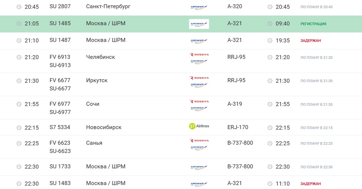 - SU 1485 — вылет по плану 09:40, задержан до 21:05;