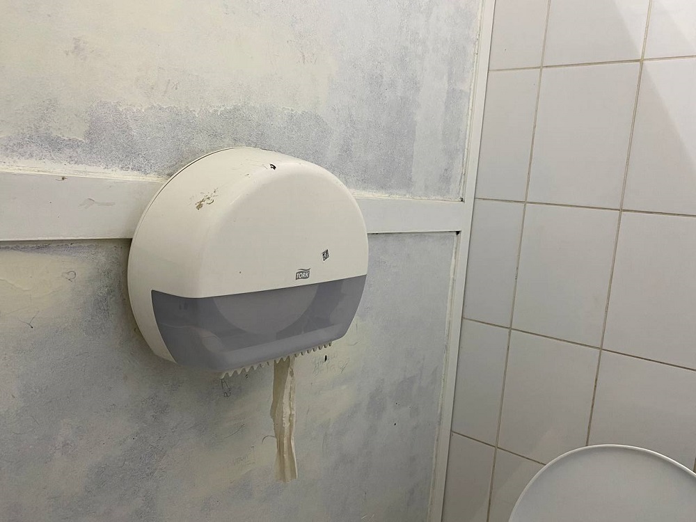 А закрашивают тут только надписи в кабинках туалетов. Но раствор какой-то полупрозрачный, поэтому выглядят стенки неопрятно. Как и держатели для туалетной бумаги — они в царапинах. А вот, кстати, бумага здесь есть практически всегда.