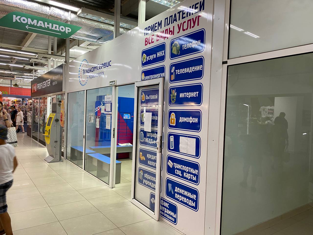 Также на цокольном этаже размещен пункт приема пластиковых крышек, а рядом главный арендатор торгового комплекса — «Командор». Кстати, именно эта компания разделяет полномочия по администрированию ТЦ. Во всяком случае за найм клининга отвечают именно они.