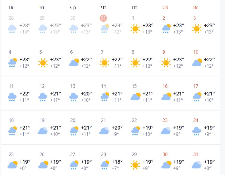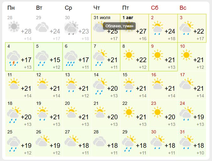 Первые дни августа обещают быть по-летнему тёплыми. Так, на 1 августа синоптики предсказывают потепление до +27°С, а на выходных ожидается 24..25°С тепла. Правда, возможны дожди.