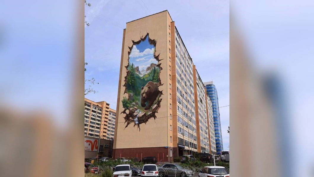Новый мурал украсил дом № 20 на улице Карамзина. Изображение на фасаде создали с 3D-эффектом — «окно», в котором виден бурый медведь и лес.