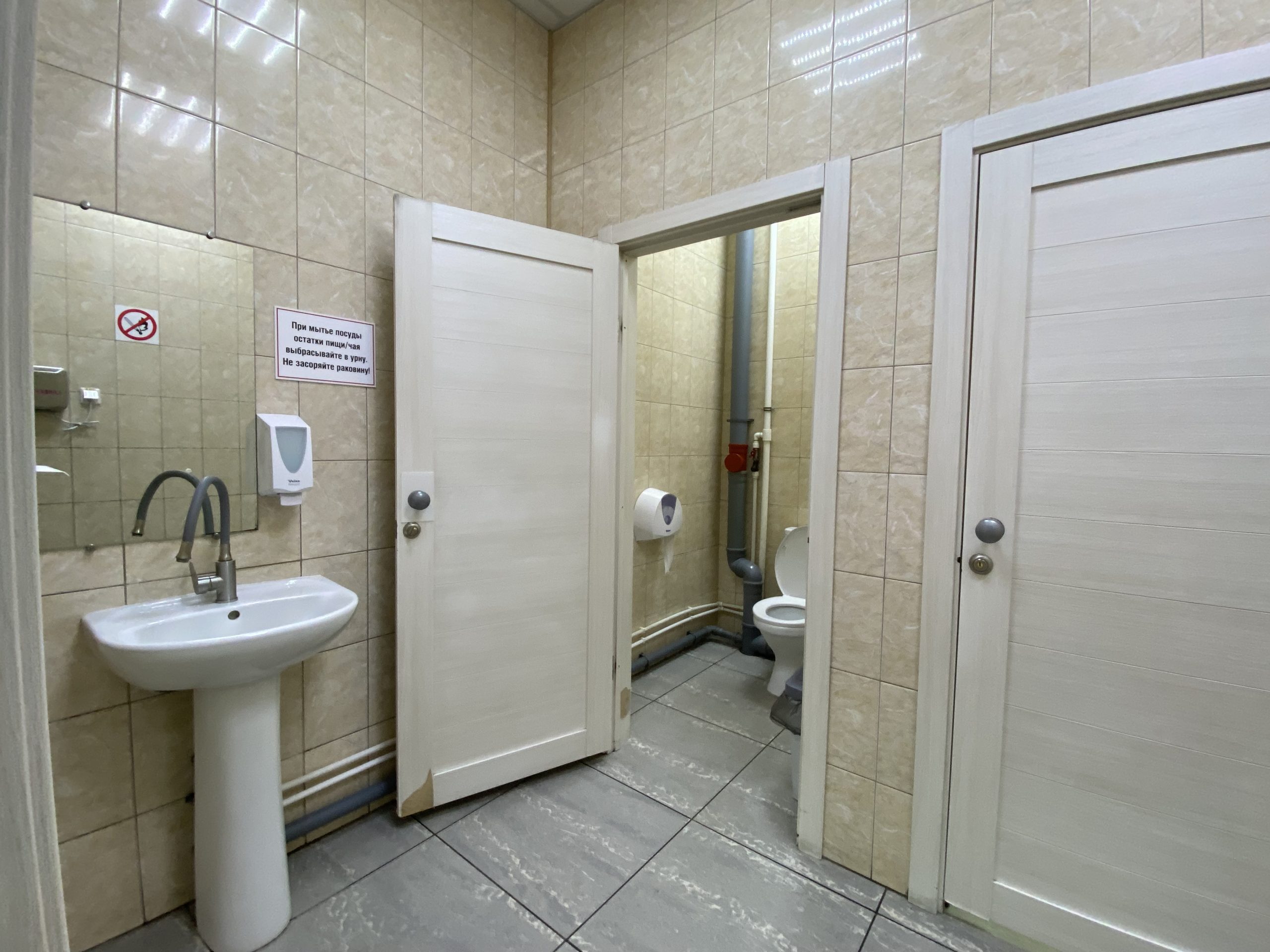 Сантехника, да и туалетные комнаты в целом — чистые. Мыло, санитайзер, туалетная бумага, ёршики — всё на месте. Сушилка для рук работает исправно.