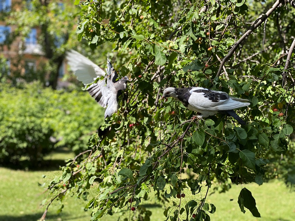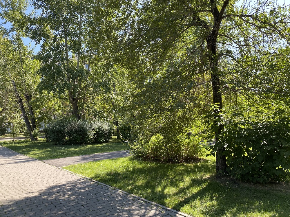 Из «культурной» зелени — пара клумб советского образца с красной сальвией. Скудненько, конечно, но всё описанное выше с лихвой окупает отсутствие цветов.