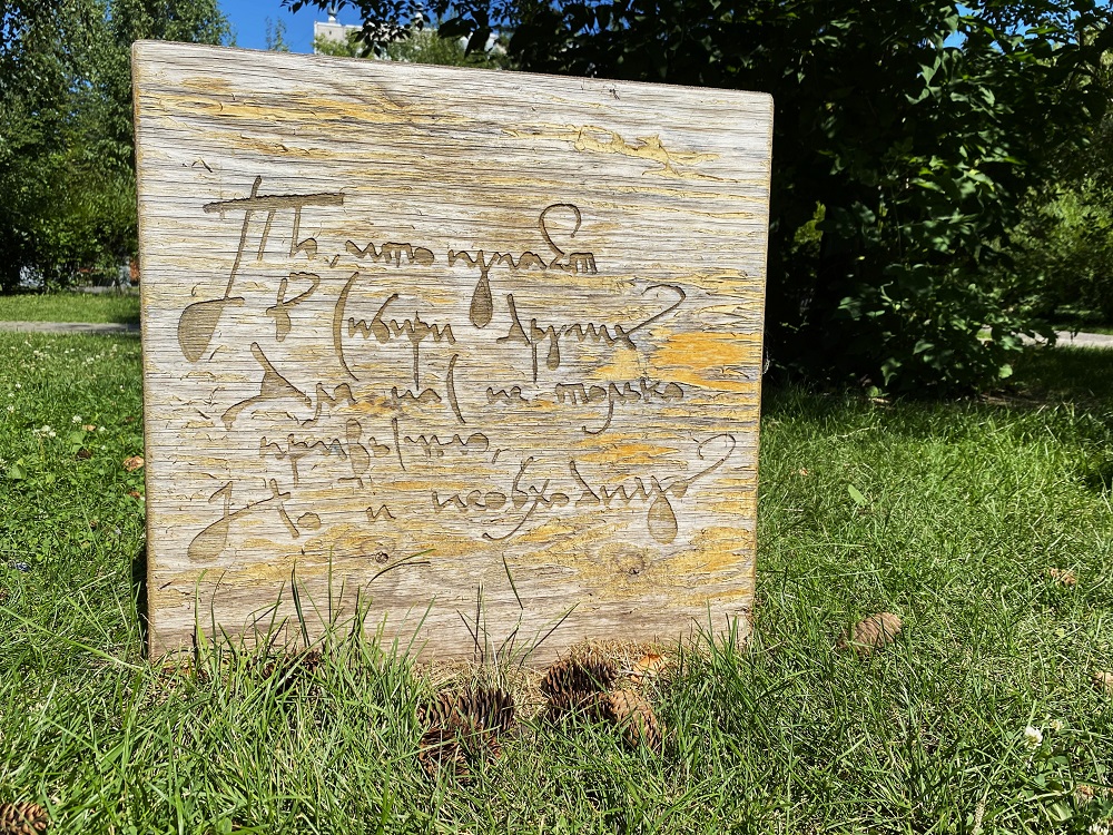 Была у сквера ещё одна фишка — кубы-табуретки с выжженными цитатами о Сибири. Они и до сих пор находятся на территории, но большинство вырвано из земли, и на каждом облупилось покрытие. Так что прочитать удаётся далеко не все высказывания. Местные жители выразили надежду, что когда-нибудь кубики приведут-таки в порядок.