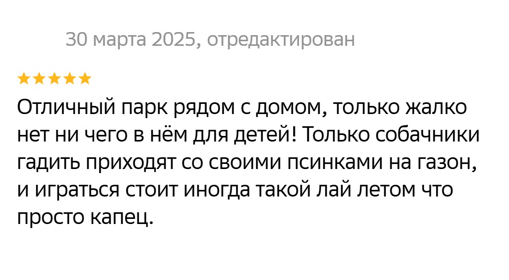 Нет площадки для животных — с пёсиками тут гуляют где придётся. Хозяева, предполагаем, добросовестные, потому что мы органических отходов где бы то ни было не обнаружили. Однако некоторые на собачников всё же жалуются.