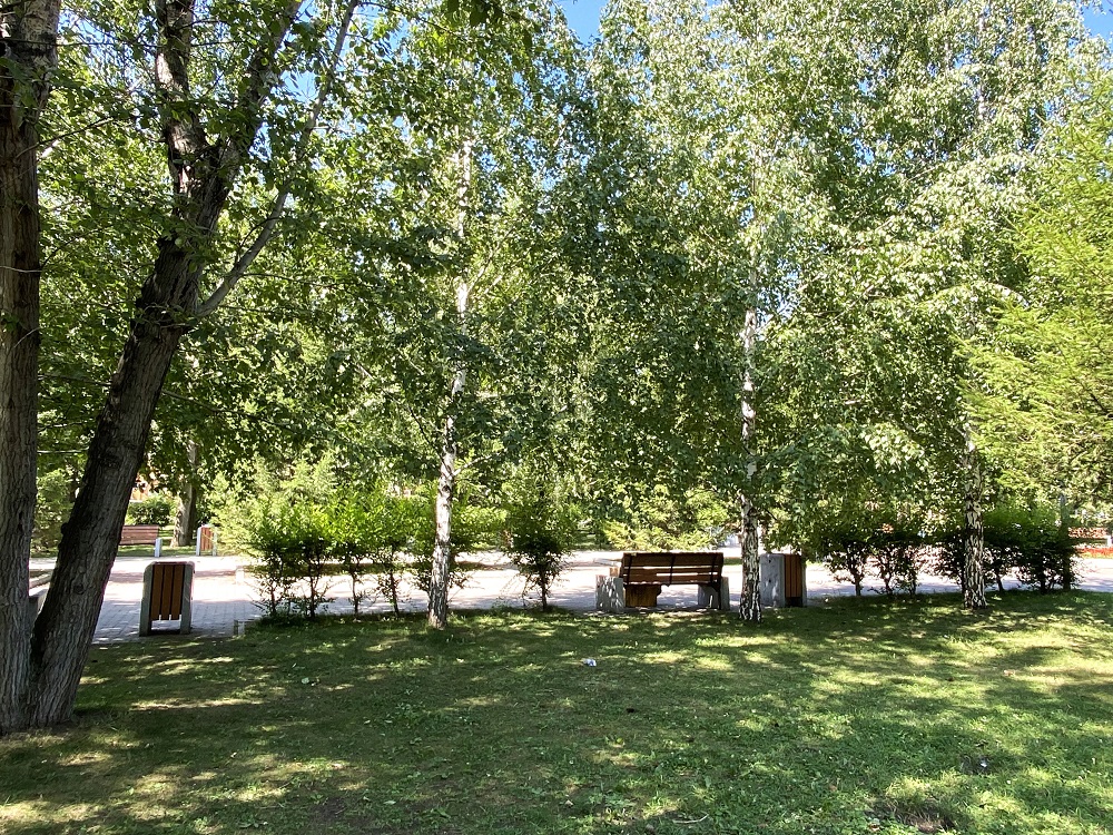«Скверная» мебель совсем даже не скверная. Лавочки с высокими и удобными спинками, широкими сиденьями, крепкие, целые, вот только выглядят неопрятно — их явно пора помыть и, вероятно, покрыть защитным средством.