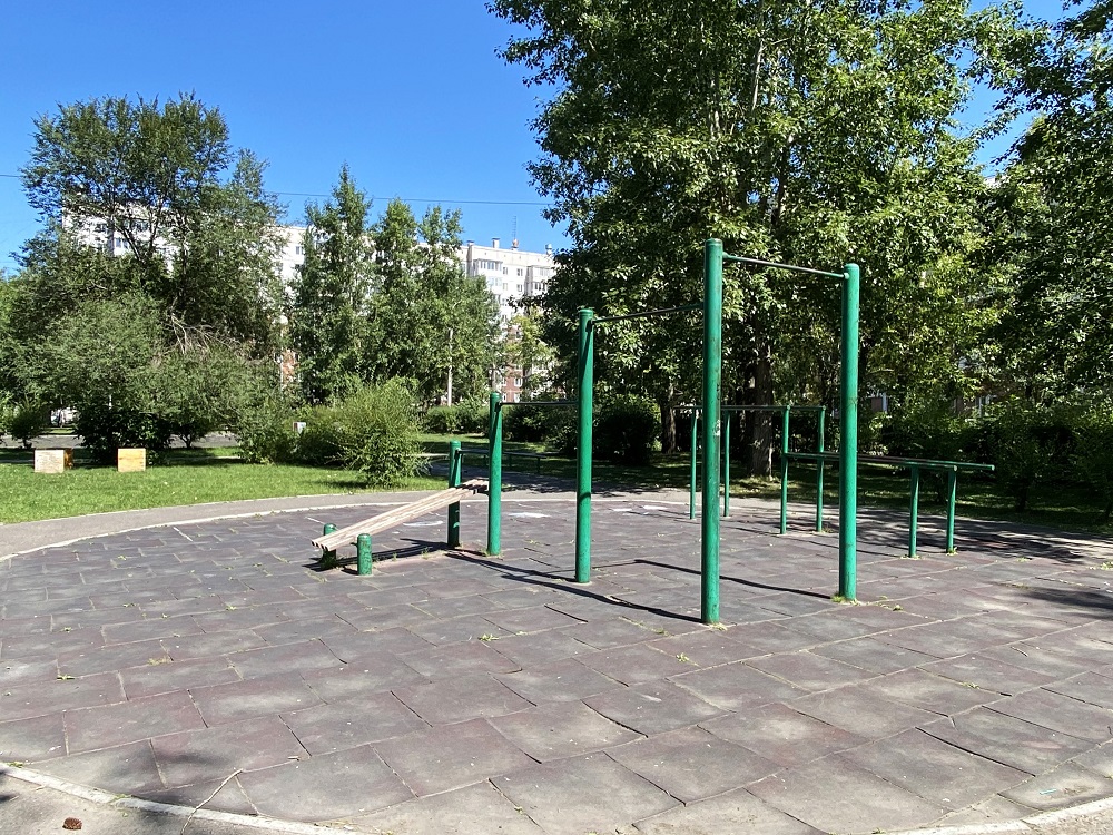 Дети постарше, да и взрослые могут позаниматься на спортплощадке. Она также располагается по левую руку от основного променада, в самом его конце. Инвентаря тут, конечно, маловато — три турника, брусья и скамейка для пресса — но, если проявить спортивную фантазию, можно и подкачаться.