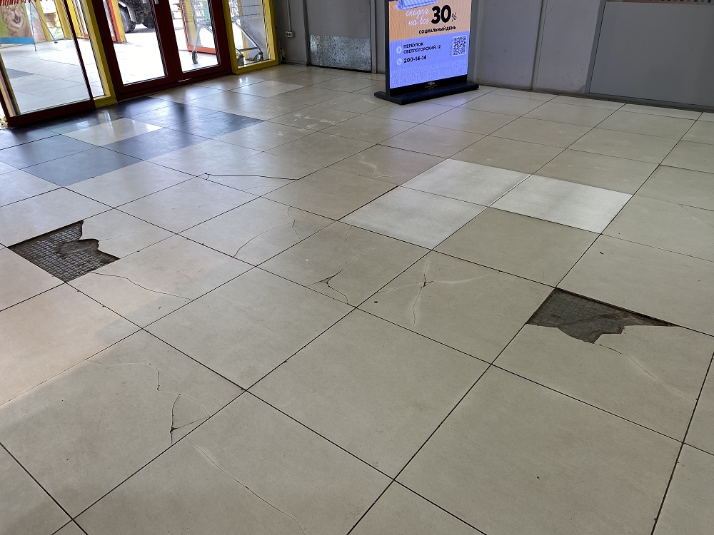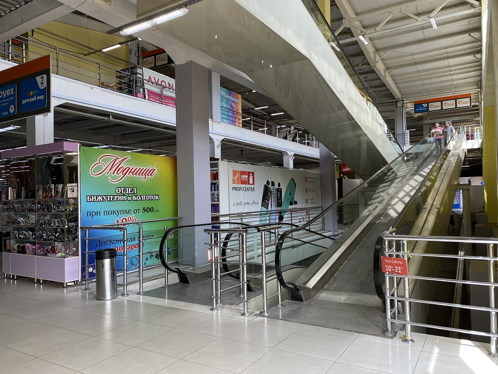 Что касается доступной среды, для удобства передвижения людей на инвалидных креслах и мамочек с колясками в ТЦ работает траволатор. На входах с раздвижными дверьми пологие пороги. Правда, состояние их омрачено всё теми же выбоинами.