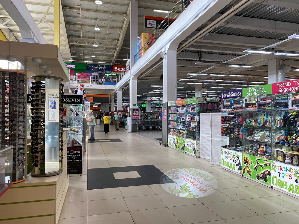 «В наличии» аптека и оптика, бижутерия и несколько ювелирных, бытовая техника и гаджеты, немного тесный, но интересный отдел с подарками и сувенирами, зоомагазин, азиатские товары в категориях: еда, одежда, быт. Есть специализированный отдел со спортивным питанием. А есть — с сибирскими берестяными изделиями и угощениям