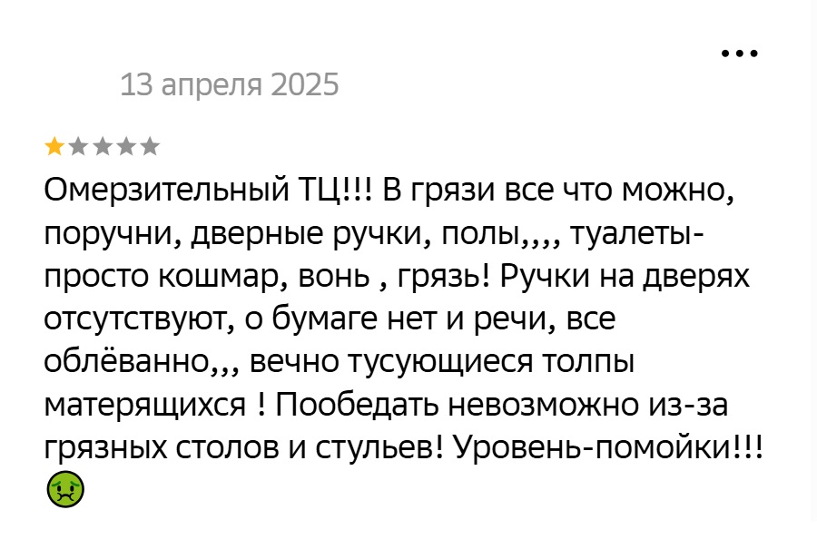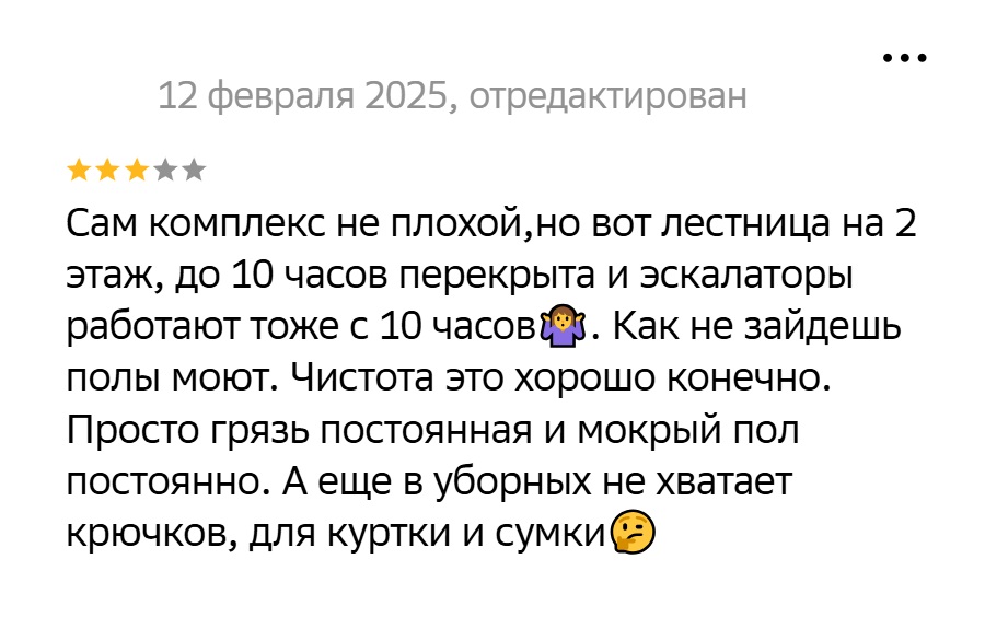 Сотрудников клининга мы в ТЦ тоже видели. С вёдрами они парой прогуливались по просторам второго этажа. Стены, пол, двери и дверные ручки тем временем оставались грязными. И так, судя по тому, что красноярцы пишут в отзывах, всегда.