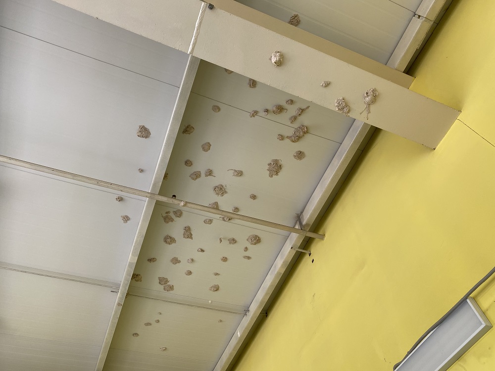 Настоящий арт-объект — потолок, «декорированный» ошмётками скомканной туалетной бумаги. Помните, в школе перед Новым годом мы украшали классы — мочили ватку с ленточкой «дождика» и подбрасывали к потолку. Тут то же самое, только вместо ваты бумага, и никакого «дождика».