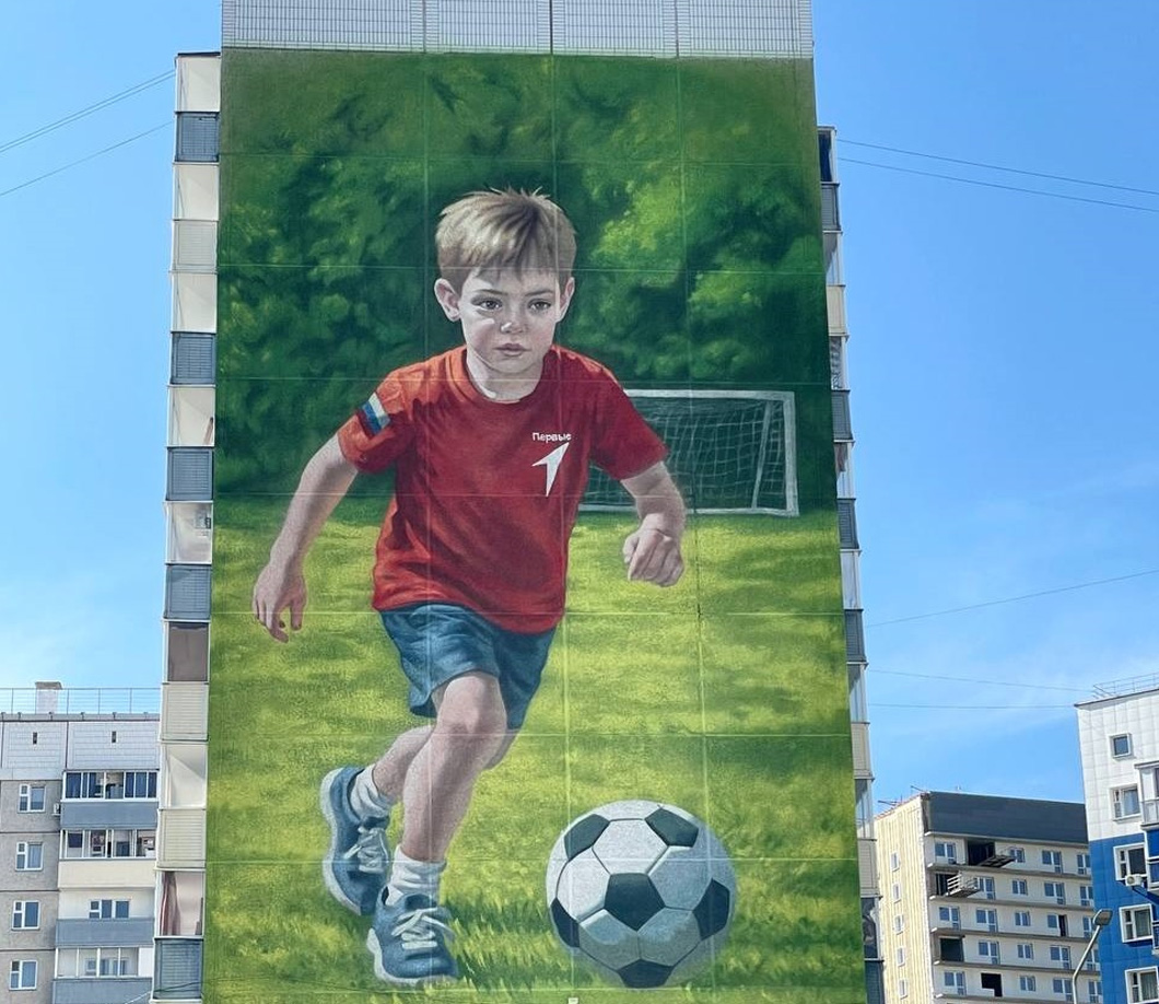 Мурал с мальчиком — инициатива участников «Движения первых». На форме ребёнка можно заметить эмблему движения.