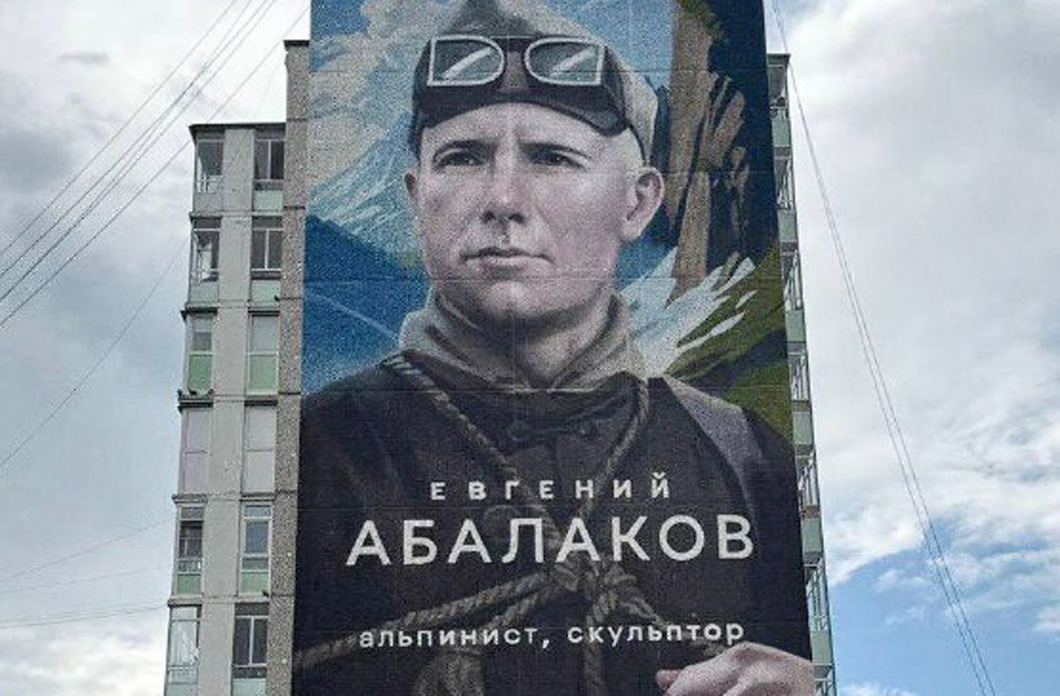 Евгения Абалакова изобразили в форме скалолаза и на фоне гор. Напомним, красноярец Абалаков — легенда советского альпинизма. В 1933 году он стал первым человеком, покорившим пик Сталина (сейчас — пик Исмоила Сомони, 7495 м). В военные годы вместе с другими альпинистами принимал участие в обороне Кавказа.
