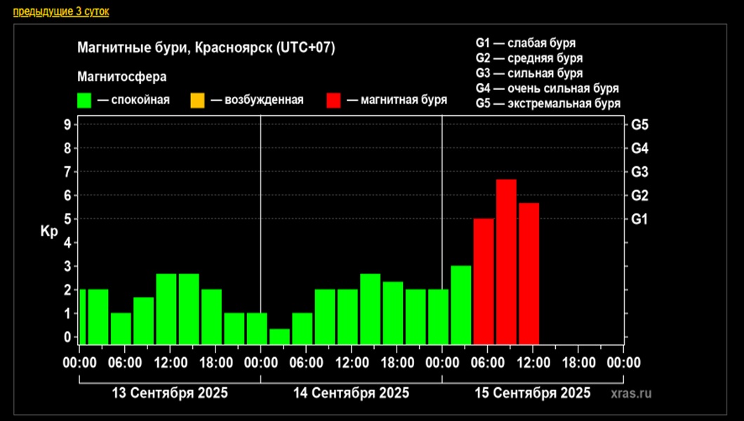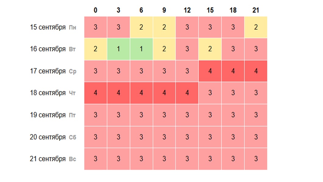 По данным портала time-in.ru, геомагнитные возмущения будут длиться с понедельника по пятницу с небольшими перерывами. С 15 по 17 сентября бури достигнут трёх баллов (слабая). Вечером 17 сентября она вырастет до четырёх баллов и продержится сутки.
