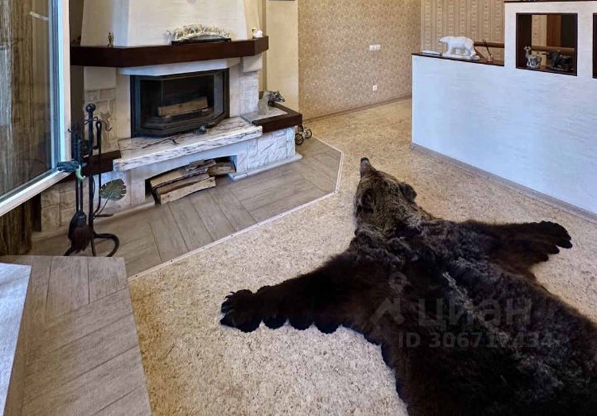 Двухуровневая квартира площадью 253 квадратных метра плюс тёплая терраса 50 м². Сделан дорогой ремонт, внутри хозяева обустроили хамам, тренажёрную комнату и помещения для хранения. Вся мебель и техника остаётся новым владельцам. В гостиной, рядом со шкурой медведя на полу, расположился дровяной камин.