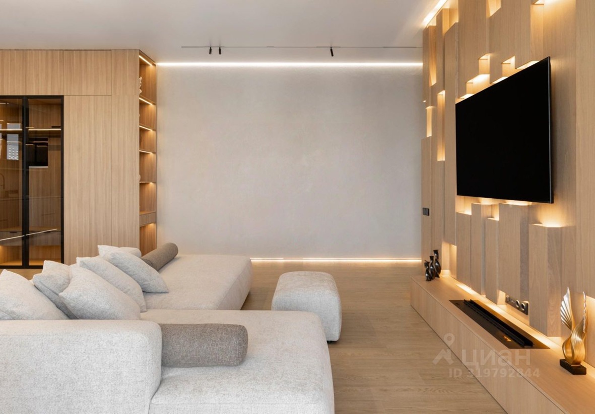 Просторная двухкомнатная квартира с кухней-гостиной в ЖК «Снегири» в Солнечном. Интерьер выполнен в светлых тонах, на стенах декоративная штукатурка. Балкон утеплён и отделан деревом. Мебель остаётся будущим владельцам.