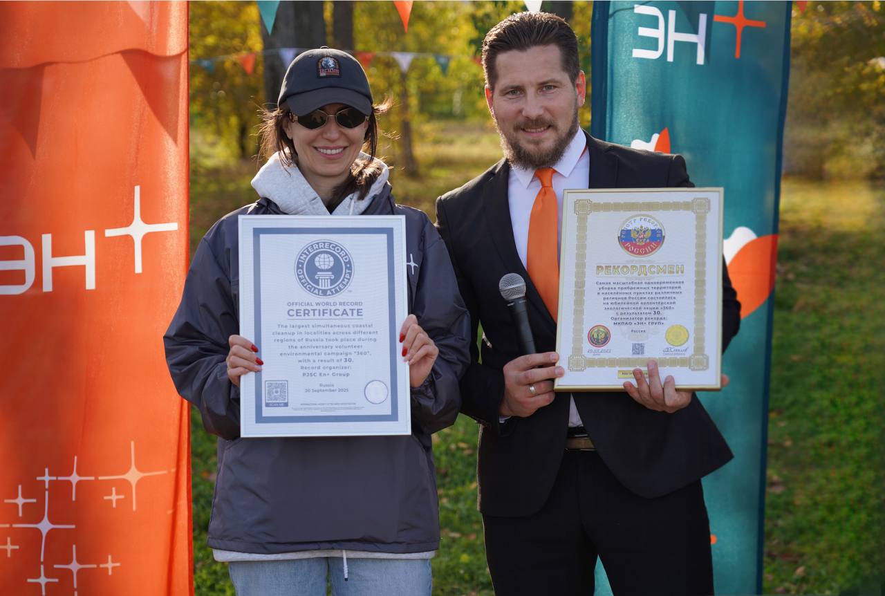 Компания Эн+ отметила 15-летие экологического проекта «360» масштабной акцией по очистке берегов водоёмов в пяти регионах России, собрав более 3500 добровольцев на 30 площадках одновременно. Это позволило установить национальный и мировой рекорды в категории «Official Excellence — Официальное Превосходство», подтвердил представитель Международной Книги Рекордов INTERRECORD на церемонии в Иркутске.