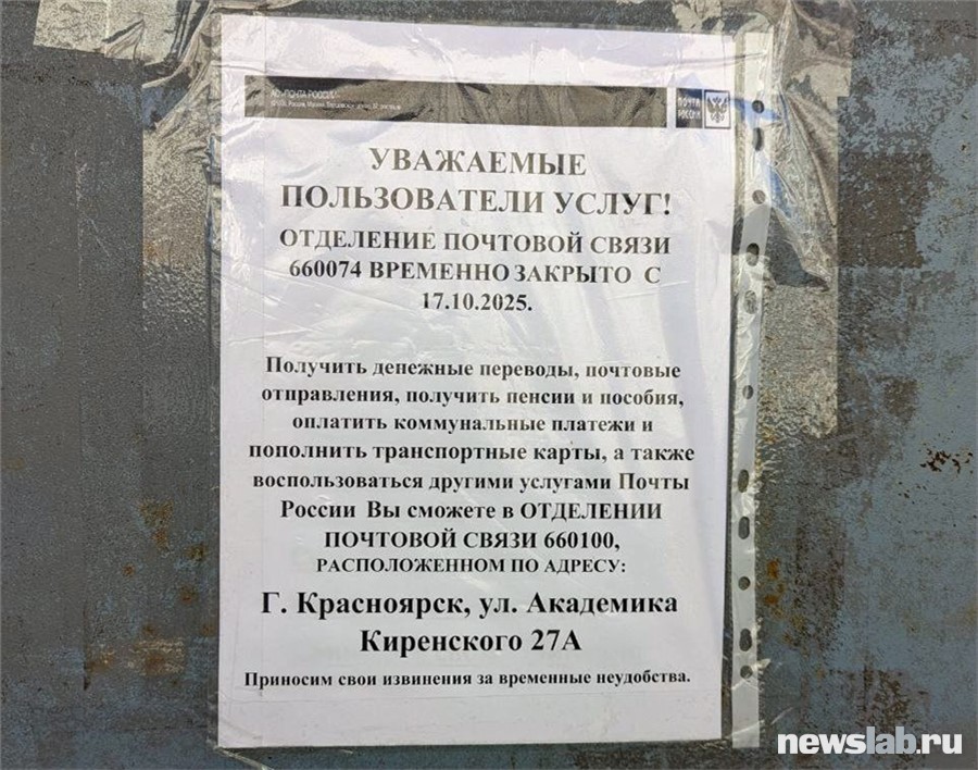 В красноярском Студгородке закрылось почтовое отделение
