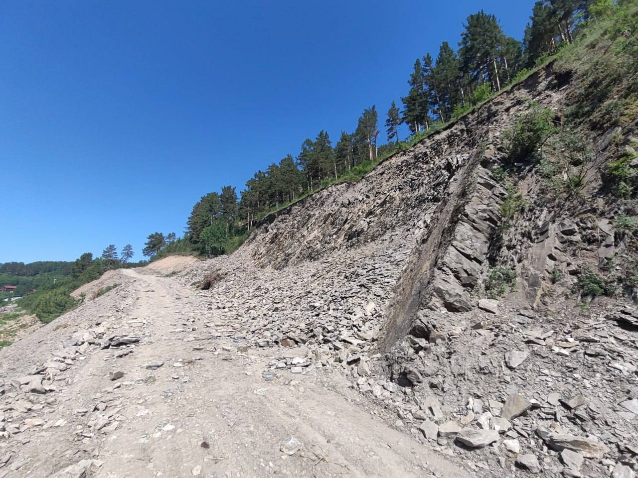 Работы развернулись на участке в мае 2025 года, здесь начали отсыпать дорогу. Однако вместо гравия использовали природный щебень, который добывали в водоохранной зоне. На это у исполнителя — ООО «Красноярский ремонтно-механический завод» — не было ни разрешения, ни лицензии.